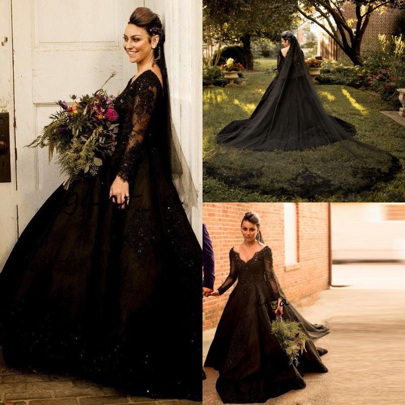 Vintage Black Gothic Wedding Dresses V Neck Lace Appliques Beaded Bridal Gowns Dieviete Lv